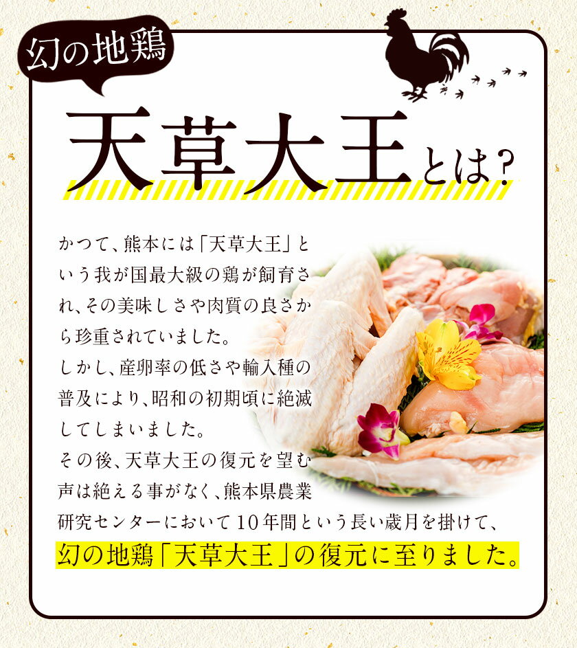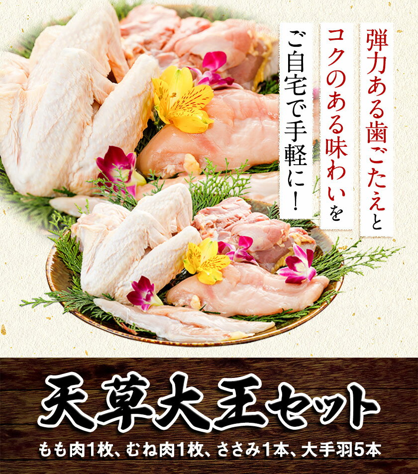 商品情報 熊本県産 天草大王セット 産地 熊本県産 内容量 鶏肉もも1枚、むね1枚、ささみ1本、大手羽5本 賞味期限 返礼品ラベルに記載 保存方法 -18度以下で冷凍 配送方法 冷凍便でお届けします。