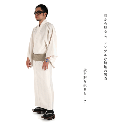 縦長く朱雀を配置しておりますので、縦長効果も生まれ、スタイル良く見せてくれますよ! 前から見ると普通の無地のゆかた。
