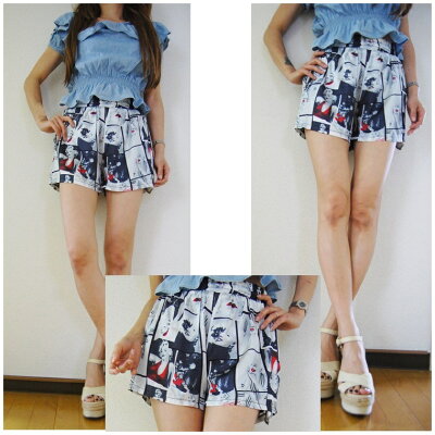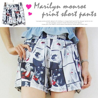 【ネコポス可能⇒送料300円】マリリンモンロープリント柄ショートパンツ1色/転写/ボトム/レディース/ショーパン/ズボン/モノトーン/ブラック/ホワイト/黒白/フォト/ウエストゴム/サテン/インスタ/モノクローム/個性/ハイウエストデザイン