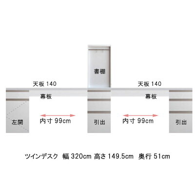ツインデスク 幅320 奥行51 高さ149.5cm 書棚付き ブラウンBR ホワイトWH パソコンデスク PCデスク 机 PC机 パソコン机 日本製 国産 オフィステーブル オフィス机 オフィスデスク 北欧 モダン 事務所 会議室 送料無料【QSM-50K】